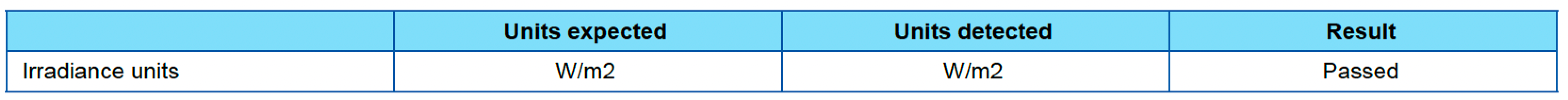 Irradiance data is expected in W/m² but may come in other irradiance or irradiation units: kW/m², Wh/m², J/m², W/ft². Mixing these can lead to incorrect analysis and misleading results while not necessarily obvious. The check verifies that the numerical values match the expected units of measure and can be trusted.