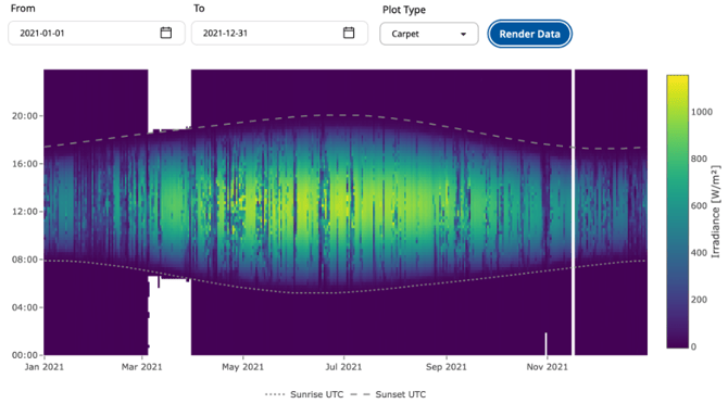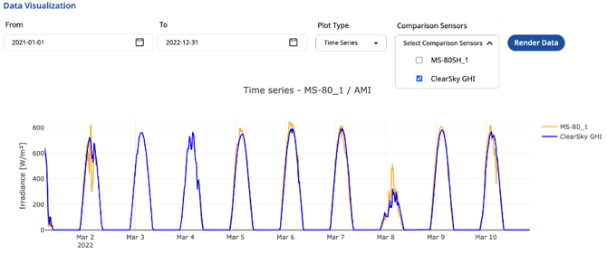 Use Time Series plot to visualize Irradiance data and visually compare multiple datasets.
