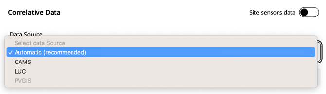 LUC data and CAMS data are recommended by default. If these options are disabled, configure the respective API tokens as described in Setup access to correlative data section. “Automatic” options allows EKO Q to choose one of the available sources based on sensor location and period of analysis.