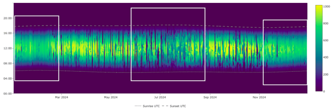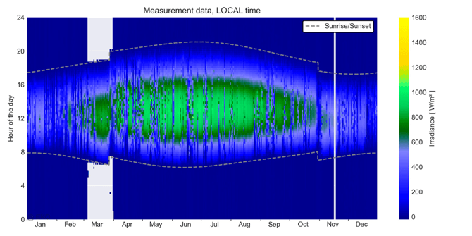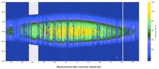 The seasonal pattern visible in the carpet plot should also make sense for the site’s latitude and climate. Summer should show longer daylight hours than winter, and midday irradiance should generally be higher during summer months. Abrupt changes in the daily pattern, such as a sudden shift of daylight hours partway through the year, can indicate changes in logger configuration, time zone settings, or data processing that occurred during the measurement period, during saving, storing, transferring and preparing the data.