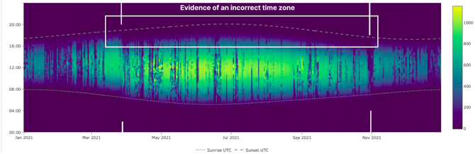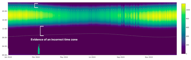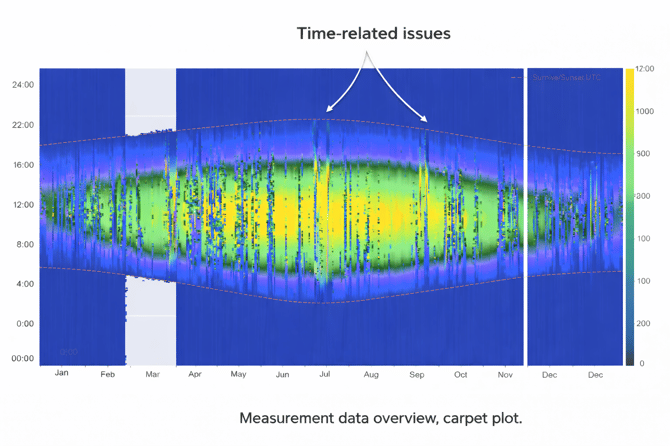 One of the first things to check is whether the data respects realistic sunrise and sunset boundaries. In a correct dataset, irradiance values should only appear between sunrise and sunset, and these boundaries should shift smoothly over the year. If significant irradiance appears clearly outside expected daylight hours, this often indicates a time-related issue, such as an incorrect time zone, missing or incorrect daylight saving time handling, or a fixed time offset in the timestamps. Because such issues affect nearly every subsequent analysis, the carpet plot is an essential early check.