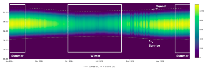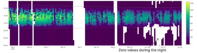 When the data is healthy, the carpet plot forms a clear and recognizable pattern that follows the movement of the sun. Daytime irradiance appears as a band of color that rises in the morning, peaks around midday, and gradually decreases toward sunset.