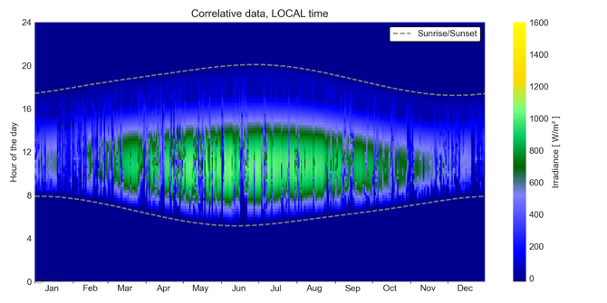 The carpet plot below shown in Local time at a location that practices Daylight Saving Time. Both the irradiance data and Sunset/Sunrise lines are shown with visible discontinuity.