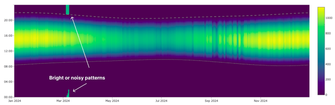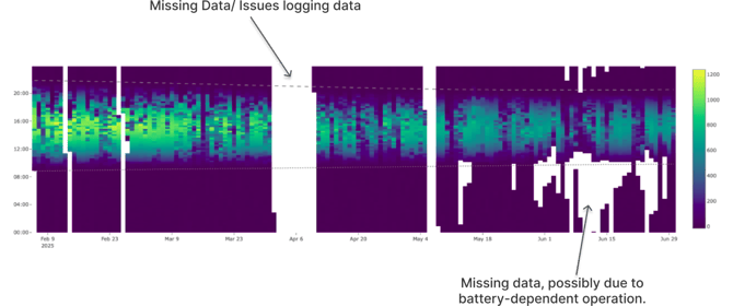 Missing data is particularly easy to spot in the carpet plot. Gaps in the dataset appear as blank or dark stripes where no values are recorded. These gaps may be vertical, indicating missing data over a continuous period, or horizontal, indicating that data is missing at certain times of day. The carpet plot does not judge whether these gaps are acceptable or expected, but it allows users to quickly see their extent, timing, and regularity.