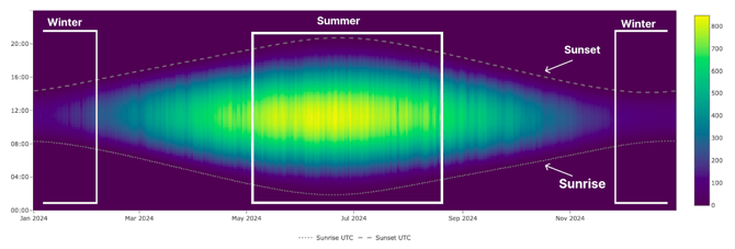 Below are two examples. The first shows a northern country, where the difference in irradiance between summer and winter is very pronounced, both in terms of intensity and daylight duration. The second example represents a tropical country in the Southern Hemisphere, where the seasonal difference in irradiance is much smaller, as is the variation in daylight duration.